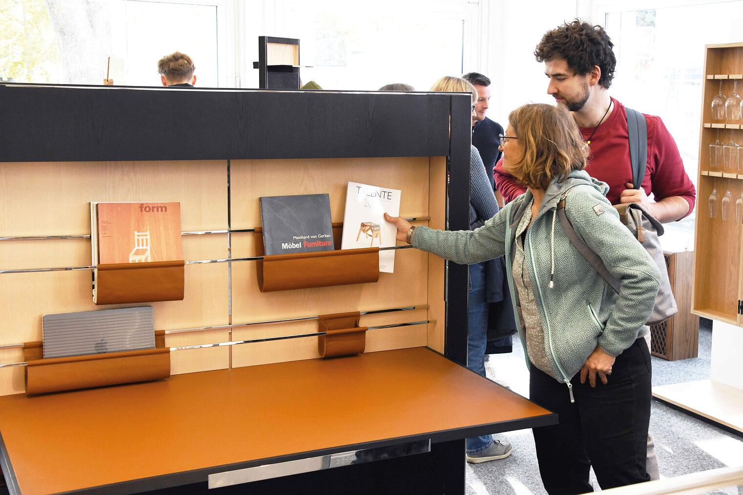 Alle Meisterstücke wurden von den Besuchern im Detail entdeckt – so wurden Schubladen und Türen geöffnet, Knöpfe gedrückt, Elemente herausgeklappt und Holzspindel gedreht. Sowohl die Besucher als auch die Meisterschüler und -schülerinnen hatten Freude am regen Austausch.